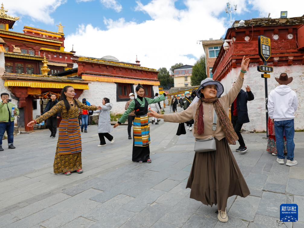 10月10日,游客(前)在理塘县勒通古镇跟着当地藏族群众跳锅庄舞。
