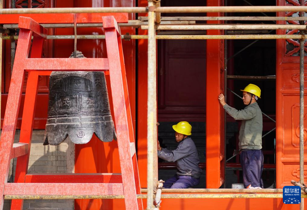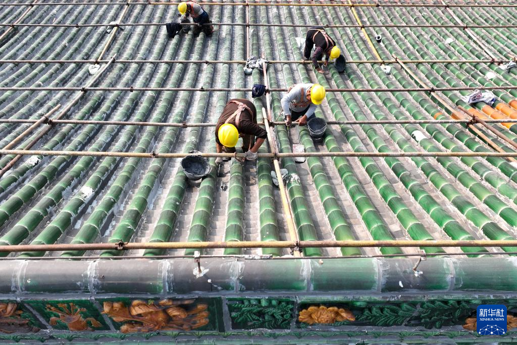 10月14日,工人在顺德府文庙大成殿进行施工作业。