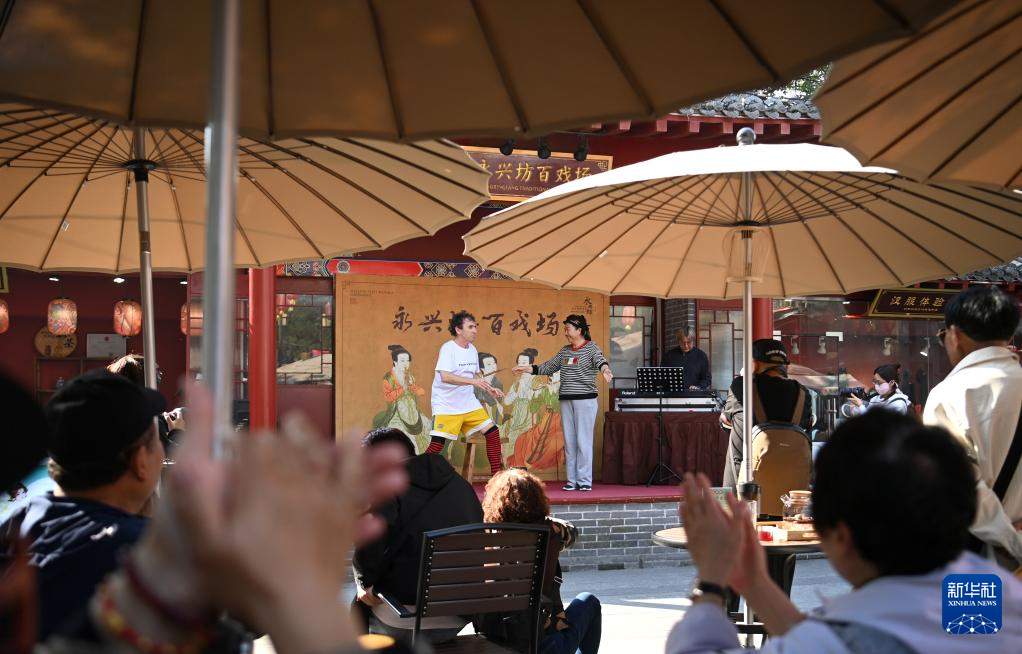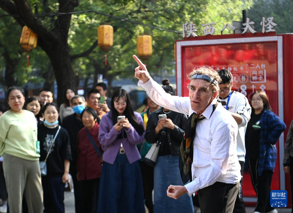 10月16日,来自斯洛伐克法帝西摩剧院的默剧表演艺术家弗拉基米尔·库利塞克(左一)在西安永兴坊进行惠民巡演时与观众互动。