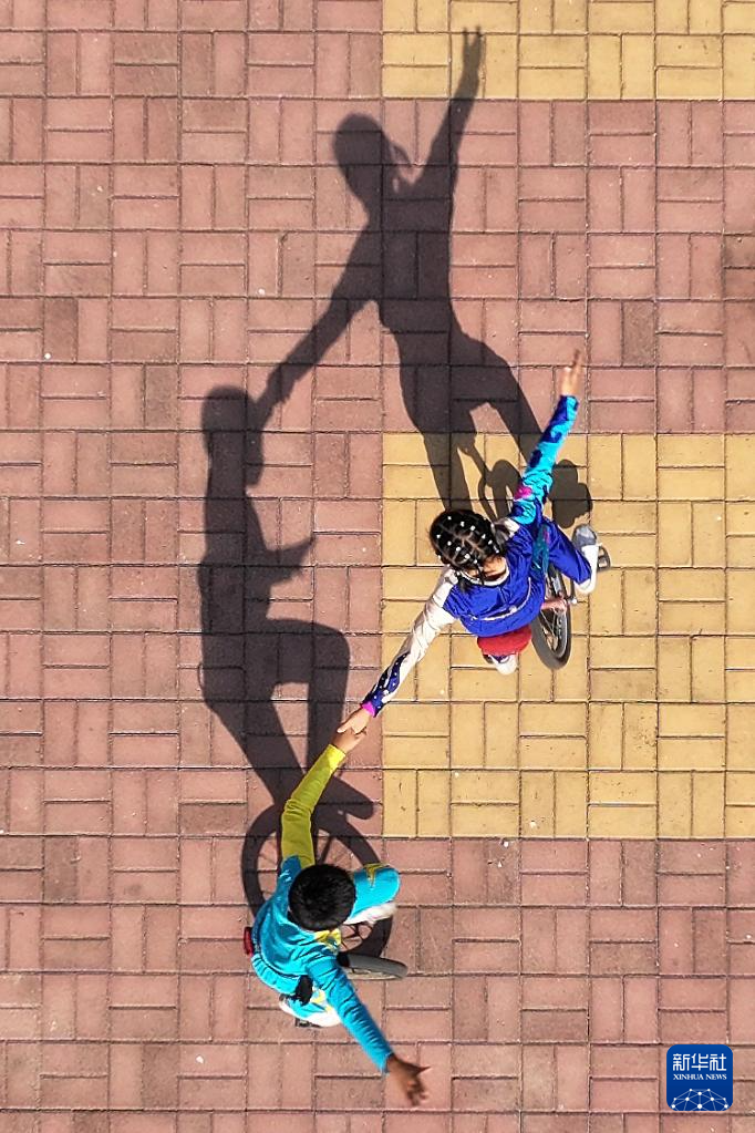 10月18日,杂技学员在河北省沧州市吴桥县于集镇东街一特色杂技小院练习杂技(无人机照片)。