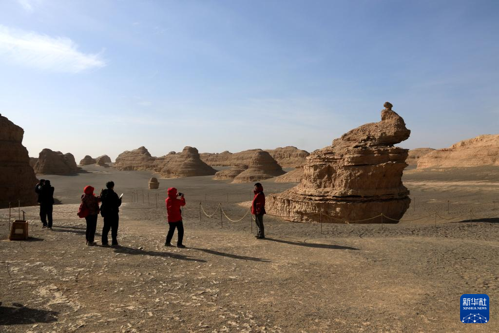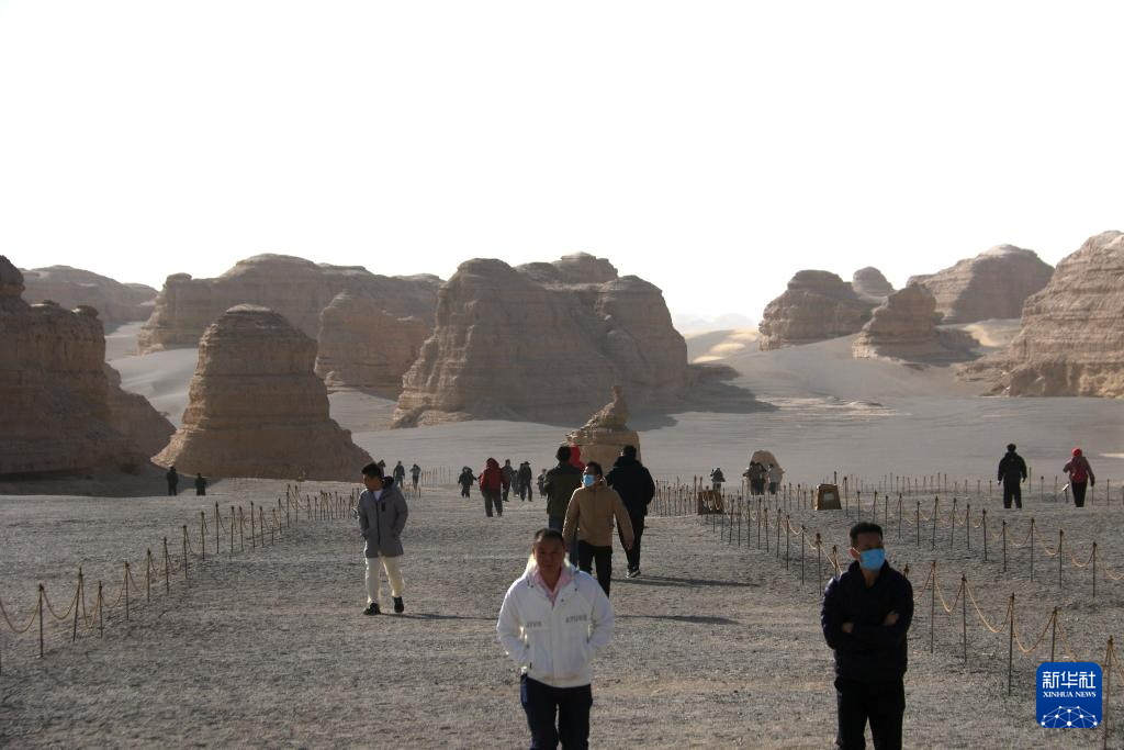 游客在敦煌世界地质公园雅丹景区内游览(11月1日摄)。