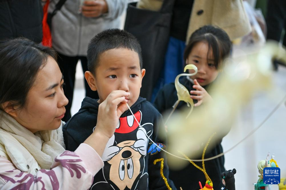 11月7日,小朋友在2023黄河非遗大展上体验吹糖人。