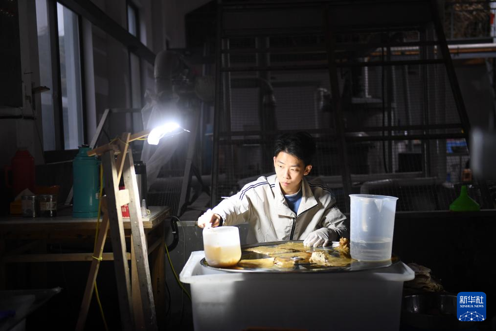11月9日,工作人员在开化纸传统技艺工坊对修复用纸进行人工除杂。