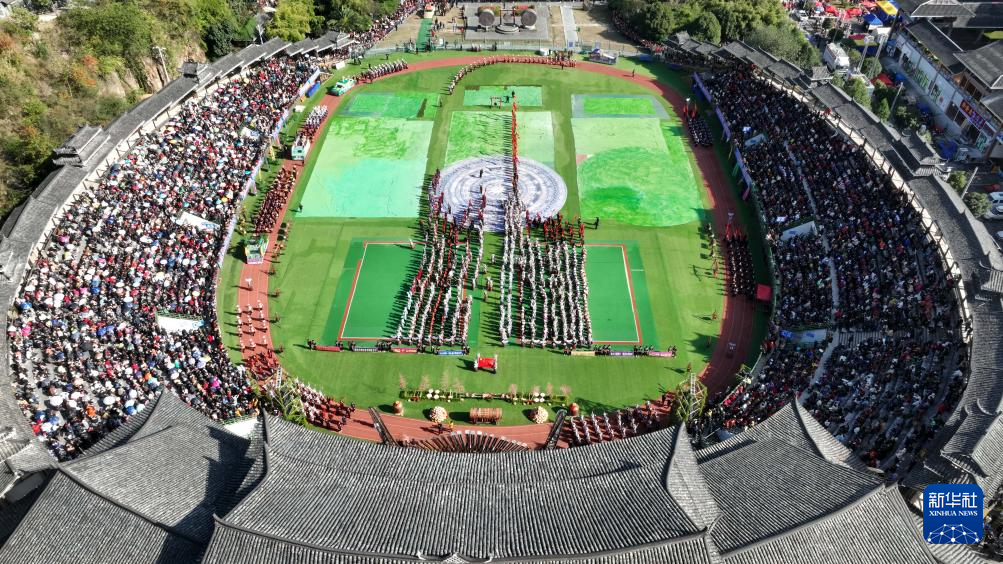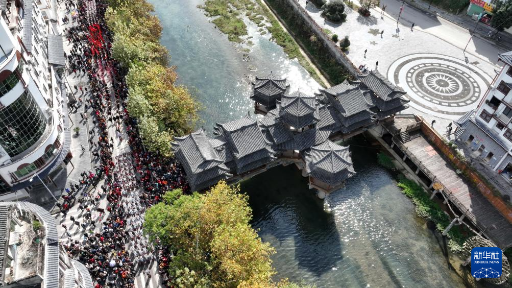 11月16日,在雷山县县城,苗族群众身着盛装,载歌载舞参加苗年和鼓藏节的巡游活动(无人机照片)。