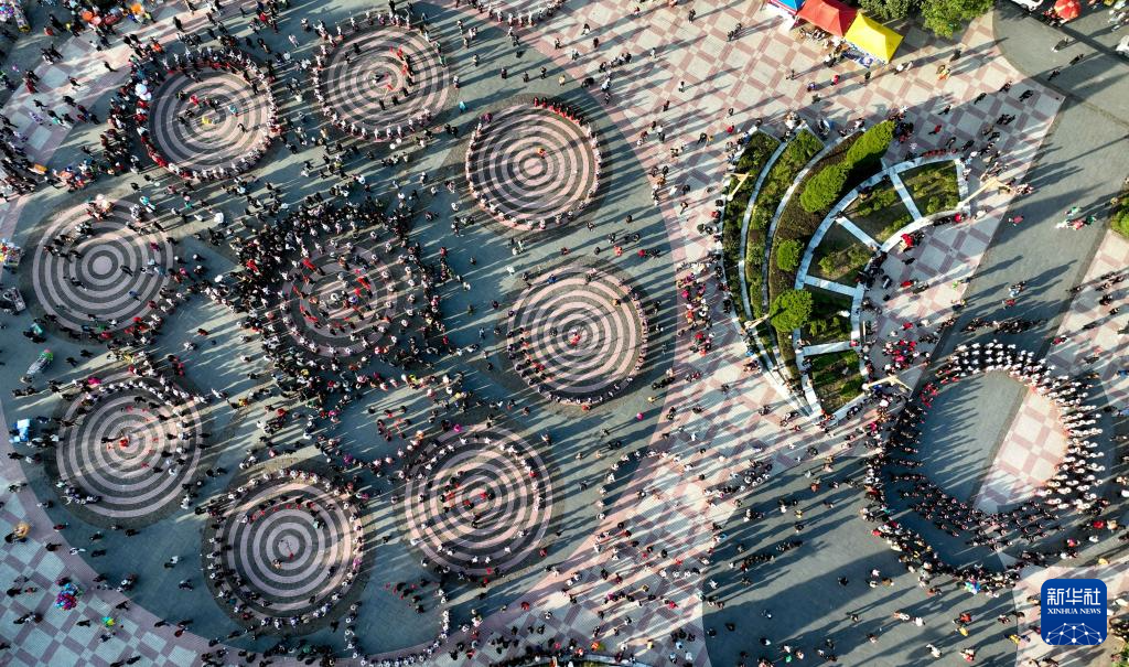 11月16日,在雷山县民族文化活动中心,苗族同胞身着盛装,载歌载舞欢庆苗年和鼓藏节(无人机照片)。
