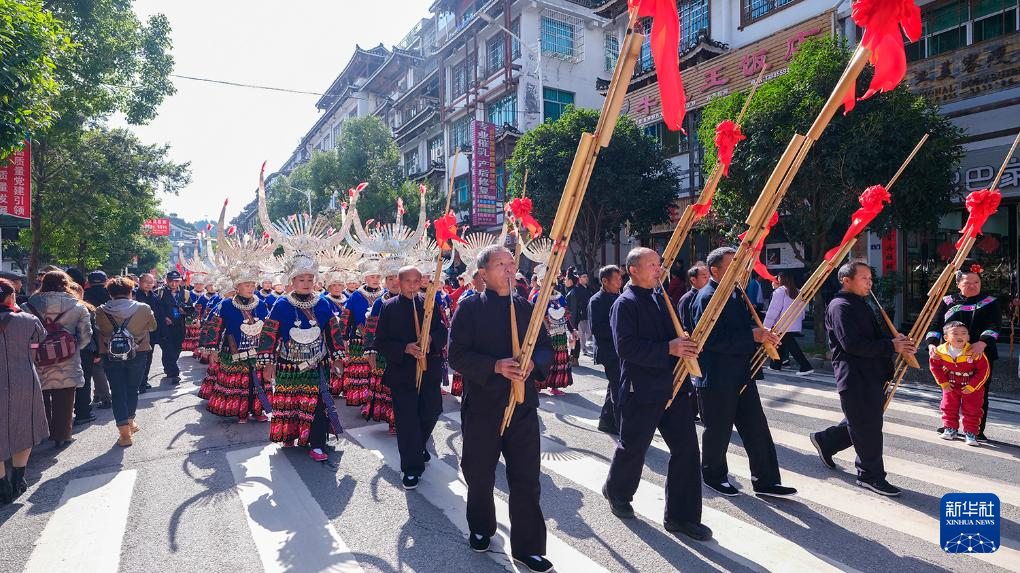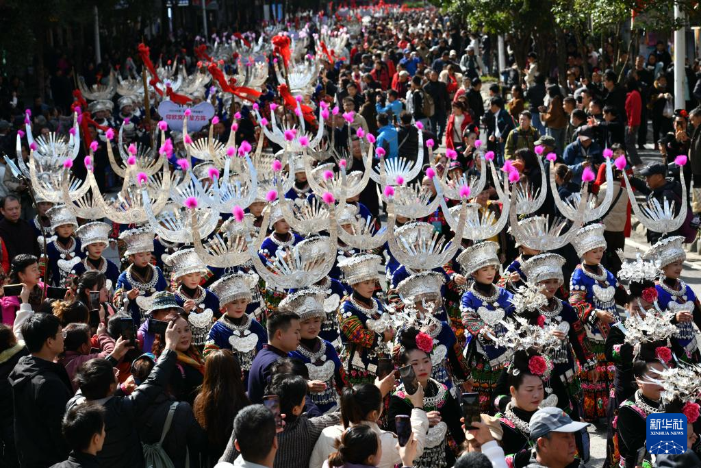 11月16日,在雷山县县城,苗族群众身着盛装,载歌载舞参加苗年和鼓藏节的巡游活动。