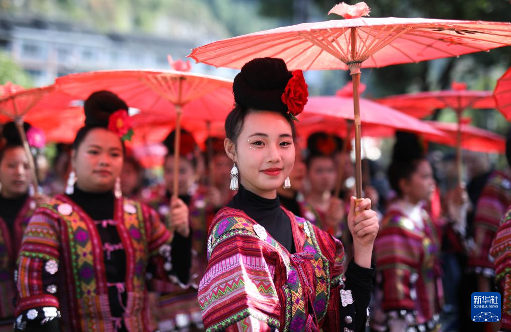 11月16日,身着节日盛装的苗族群众参加雷山县苗年盛装巡游活动。