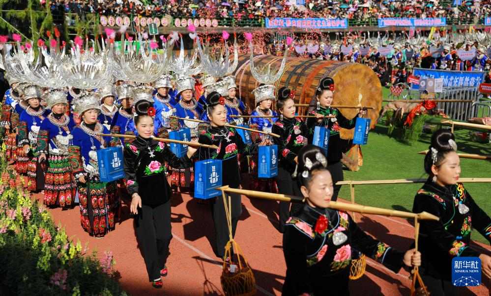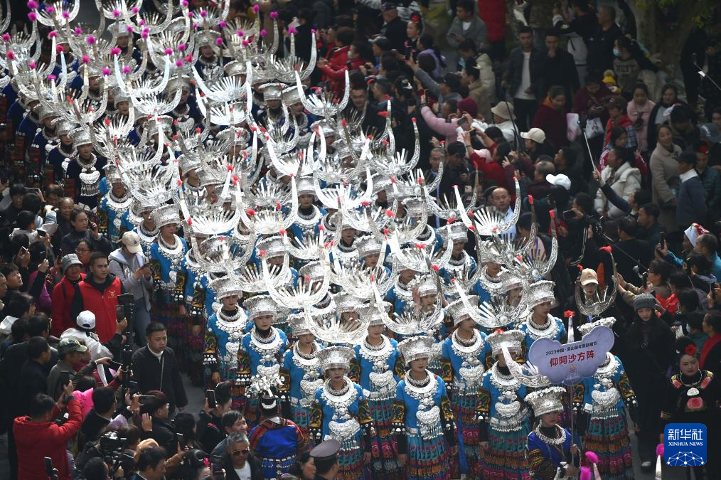 当日,贵州省黔东南苗族侗族自治州雷山县迎来苗族同胞的传统节日苗年。今年苗年又恰逢十三年一次的鼓藏节,欢乐气氛格外浓烈。来自县内外的数万名苗族群众欢聚雷山县城,通过盛装巡游、非遗展示、千人长桌宴等形式欢度节日。苗年和鼓藏节均为国家级非物质文化遗产。
