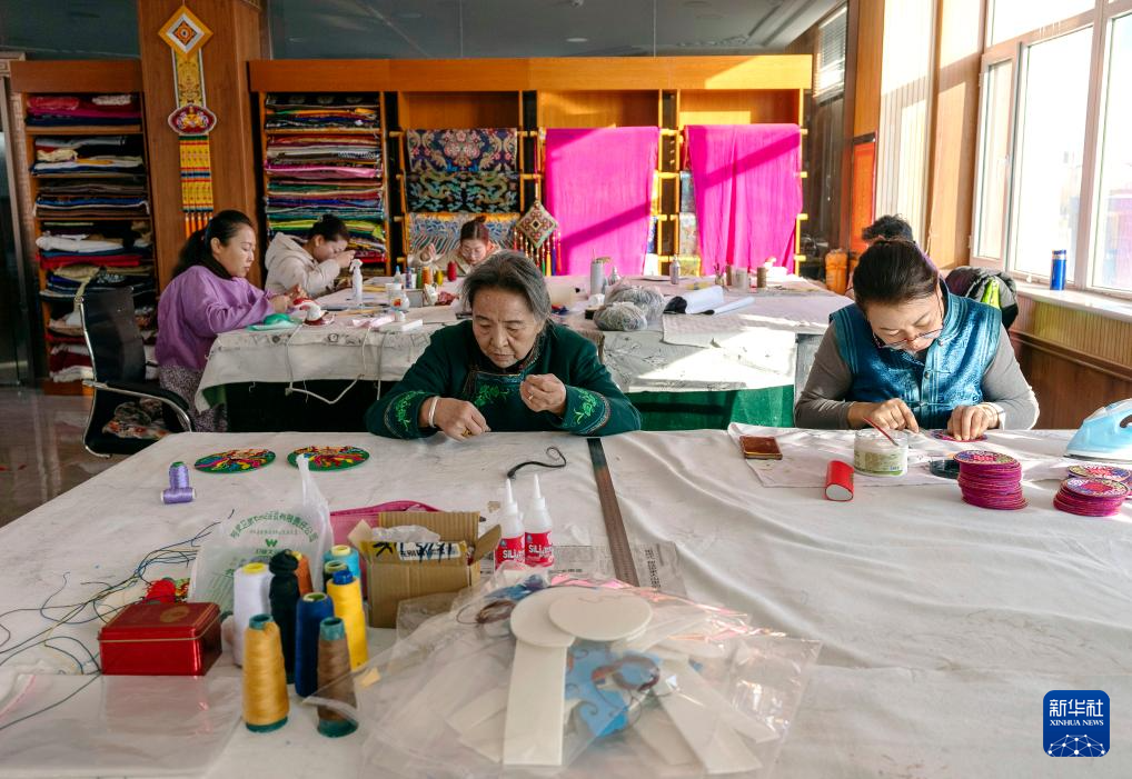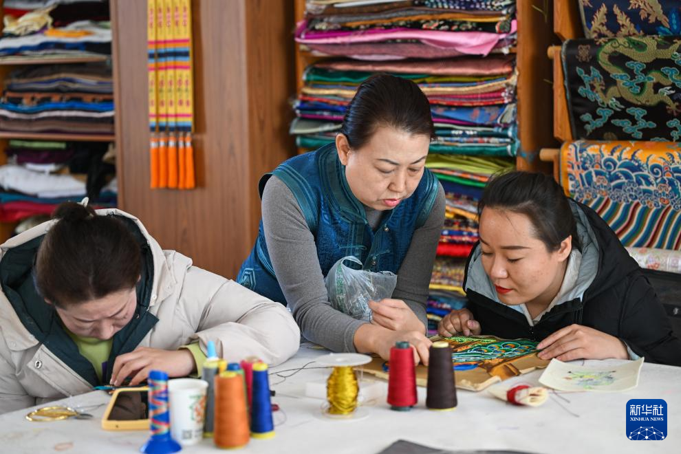 11月16日,在内蒙古阿拉善盟阿拉善左旗的马鬃绕线蒙古族唐卡传习所,陶格日勒(中)向农牧民传授制作技艺。