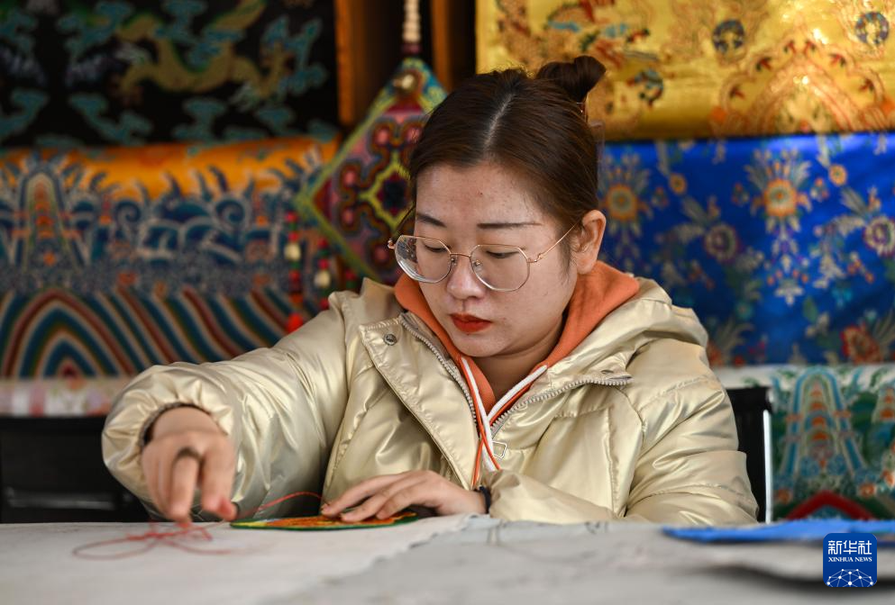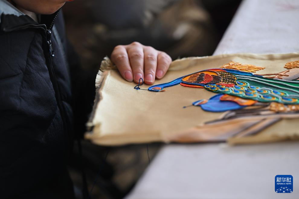 马鬃绕线、堆绣、上色……经过多道工序,一幅色彩丰富、立体感强的蒙古族唐卡作品才能制作完成。