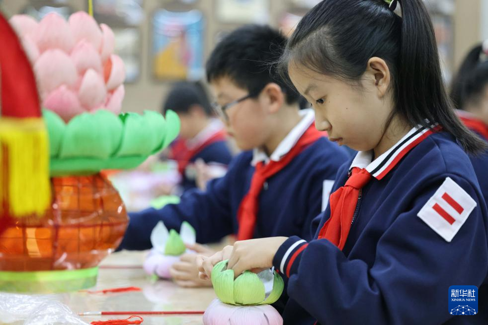 11月22日,河北省霸州市胜芳镇红光小学的学生在学习制作胜芳花灯。