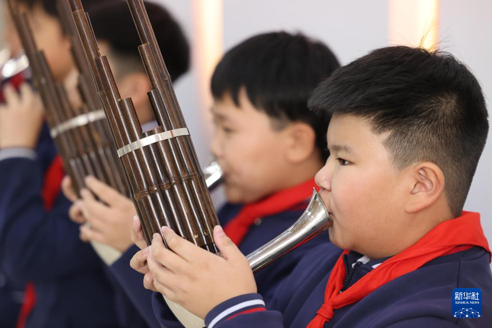 11月22日,河北省霸州市胜芳镇红光小学的学生在排练笙管乐。