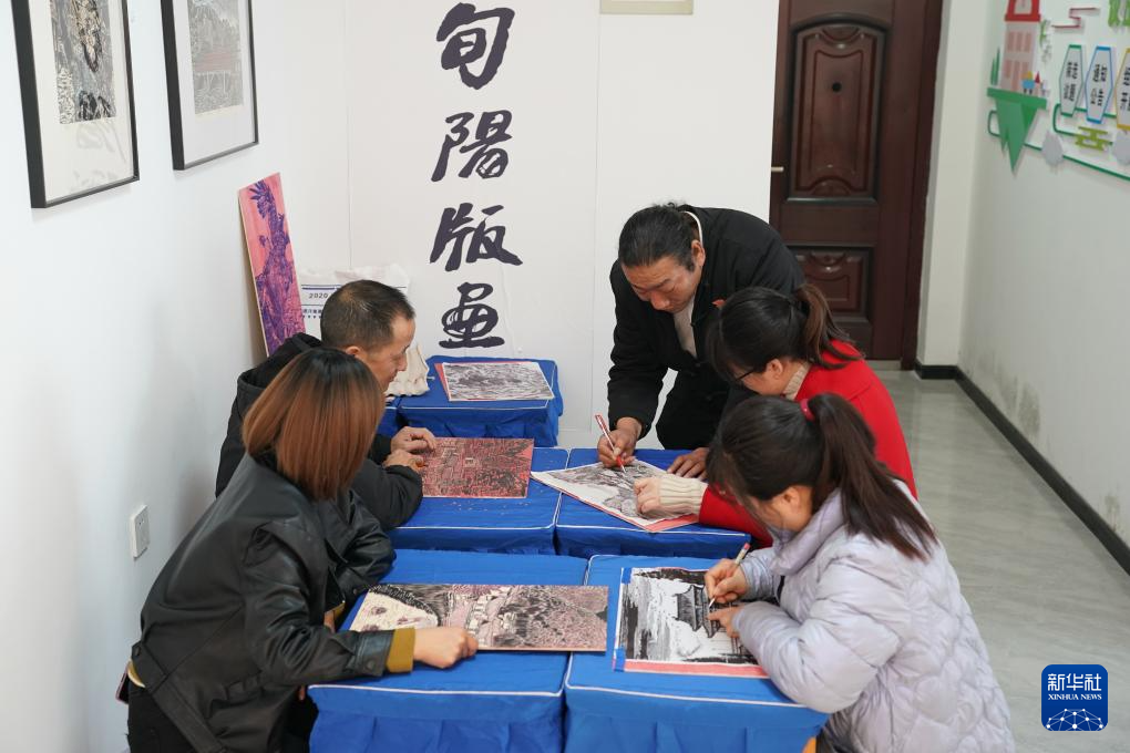 11月22日,在旬阳市城关镇四海逸家社区的一间“非遗工坊”内,旬阳市版画院院长蔚世生(中)在指导社区居民创作木刻版画。
