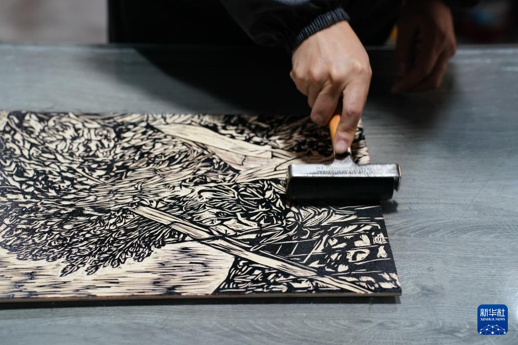 11月22日,农民版画合作社社员在旬阳市版画院内给刻版打油墨。