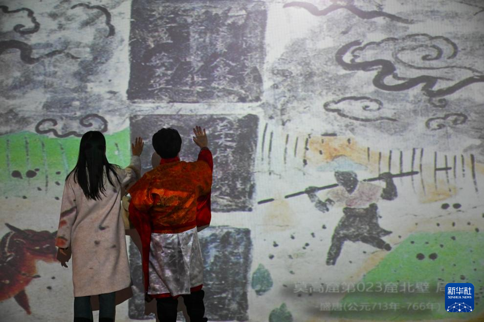 11月28日,在天津数字艺术博物馆,观众通过数字技术与敦煌壁画作品互动。