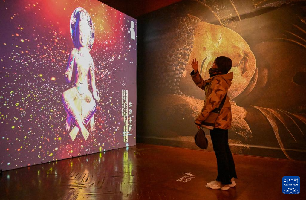 11月28日,在天津数字艺术博物馆,观众通过数字技术与敦煌文物互动。