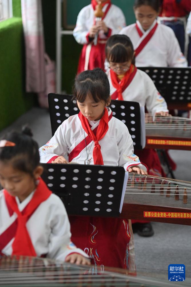 12月6日,广西梧州市藤县濛江镇中心校学生在课堂上练习古筝。