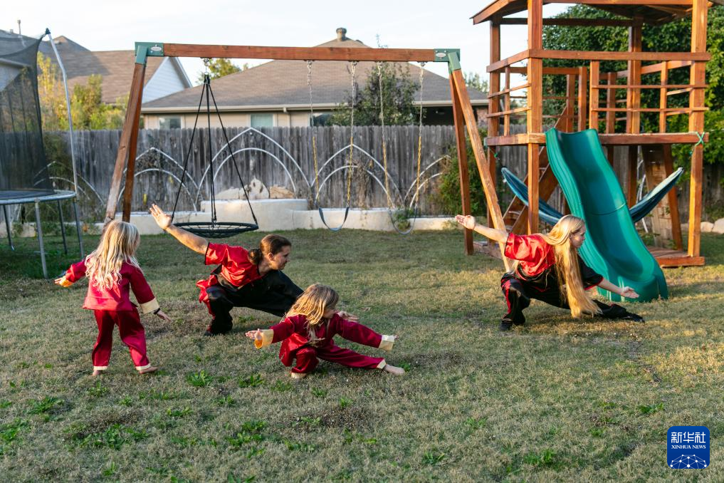 如今,夫妻俩在家中时常利用网络视频练习武术,他们的两个孩子也耳濡目染成为小武术迷。每个周末,全家会驱车一个多小时到达拉斯市郊一家功夫学校习武。