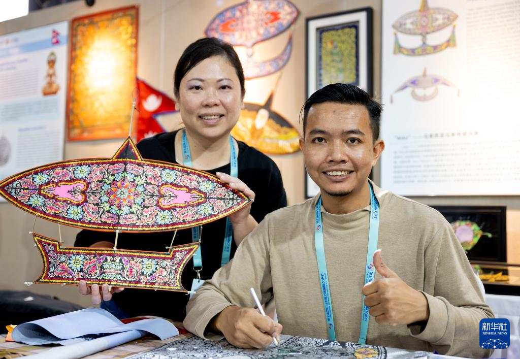 12月9日,来自马来西亚的马来风筝艺术家卢斯理(右)和合作伙伴展示自己设计绘画的艺术风筝。
