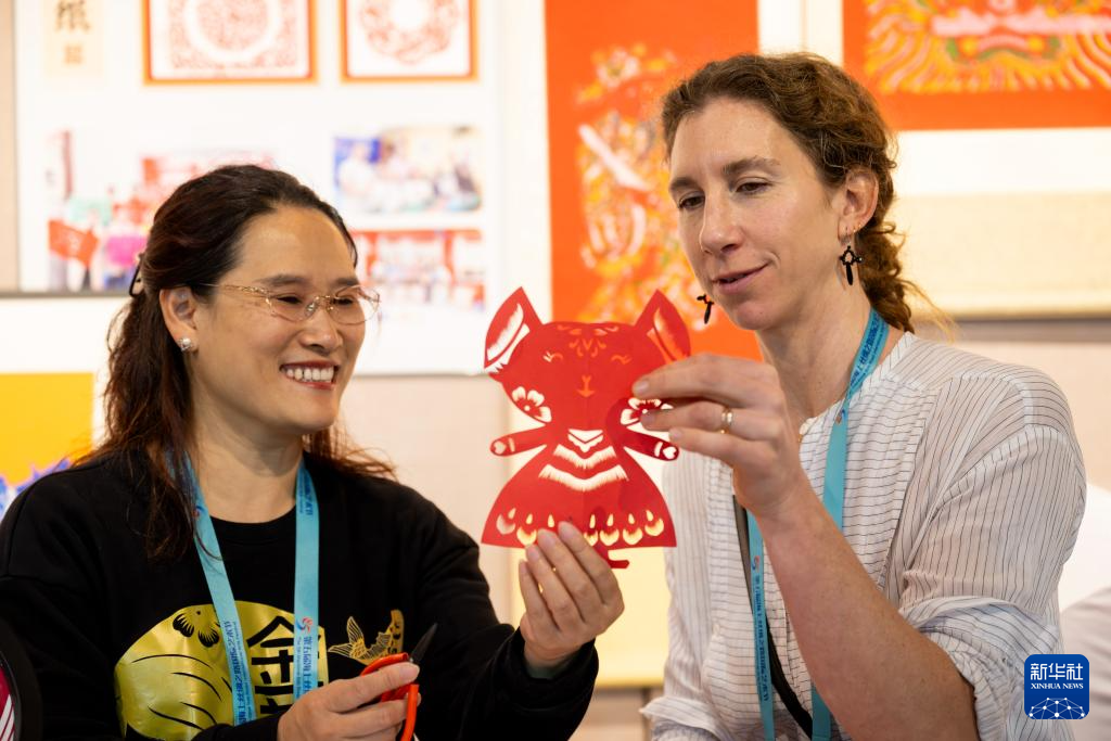 12月9日,来自意大利的艺术家(右)向国家级非物质文化遗产——漳浦剪纸市级代表性传承人游金美学习漳浦剪纸技艺。