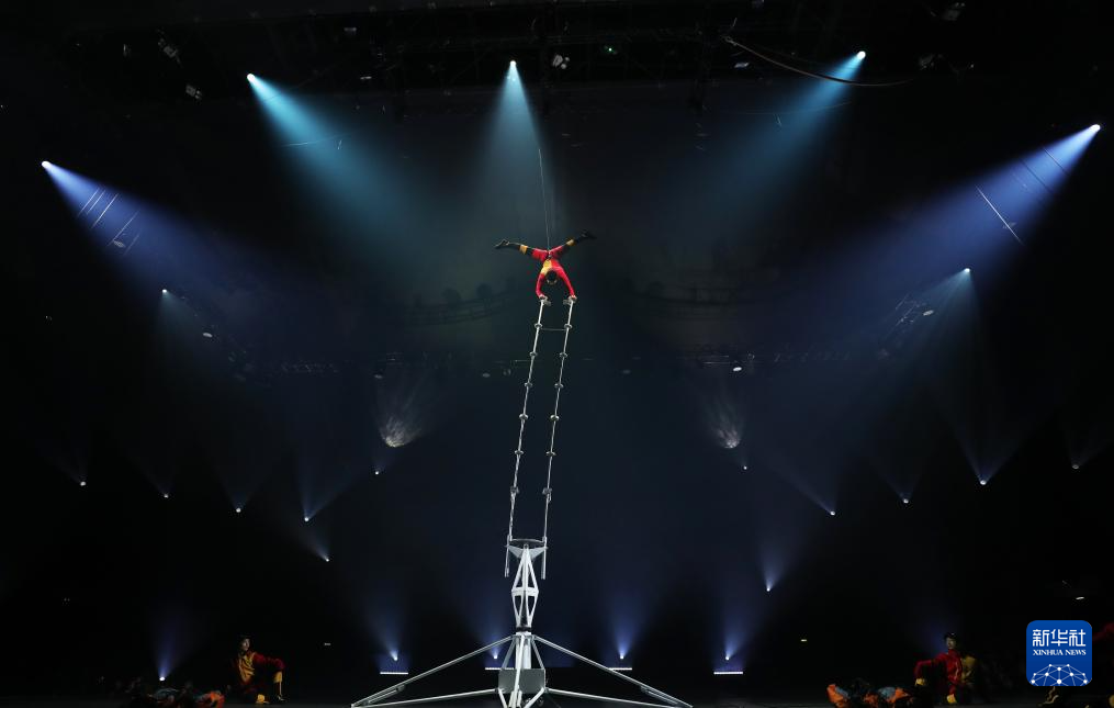 12月8日,演员在法国巴黎举行的中国杂技“奇妙之夜”演出上表演《蹬伞》。