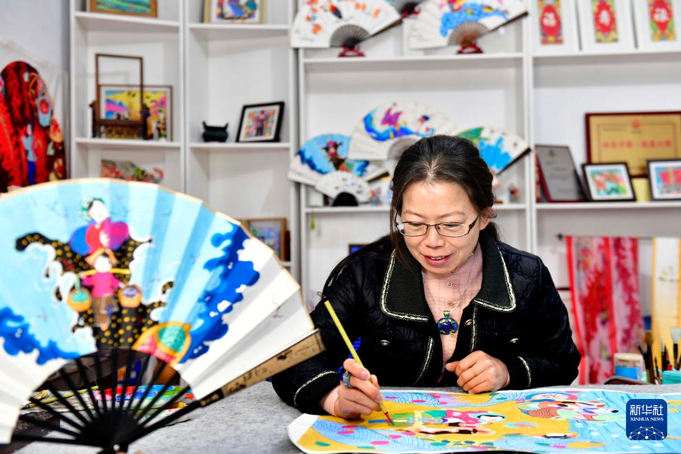 12月13日,在日照市农民画非遗工坊,非遗传承人乔诺在创作农民画。