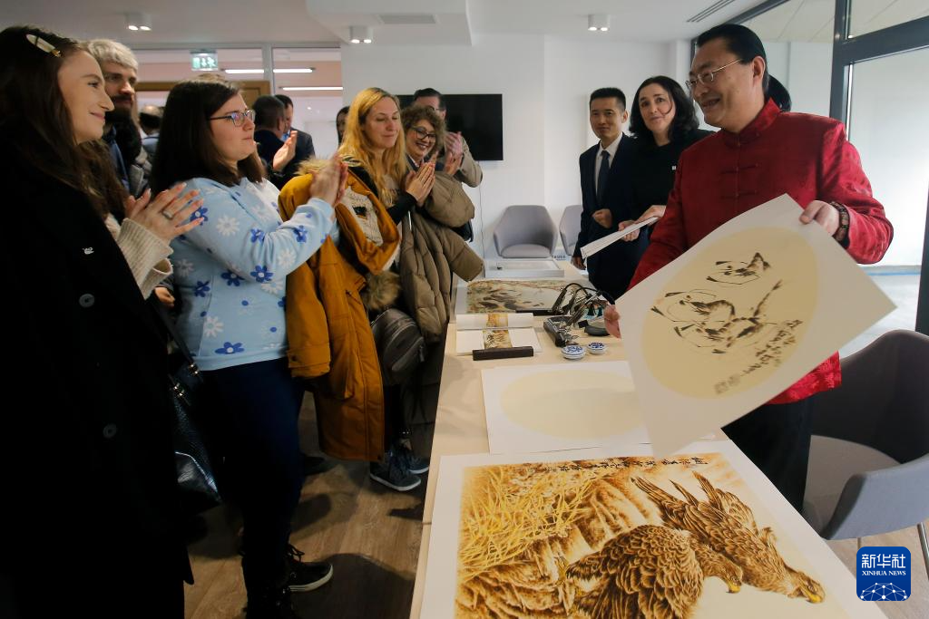 12月13日,在罗马尼亚首都布加勒斯特,来自中国辽宁省的非遗传承人李瑞群展示烙画技艺。