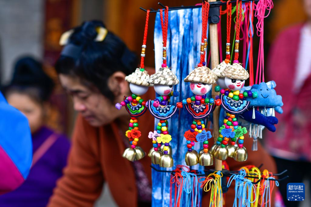 12月15日,在贵州省黎平县肇兴侗寨,侗族群众在侗年年货集市销售文创产品。