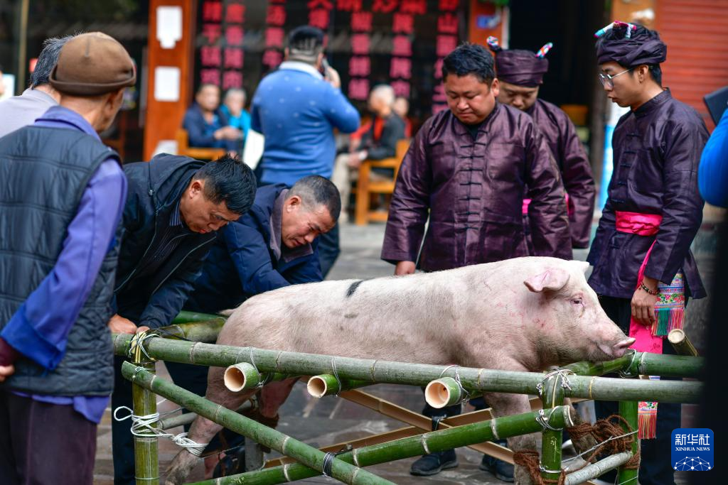 12月15日,在贵州省黎平县肇兴侗寨,侗族群众在准备年猪。