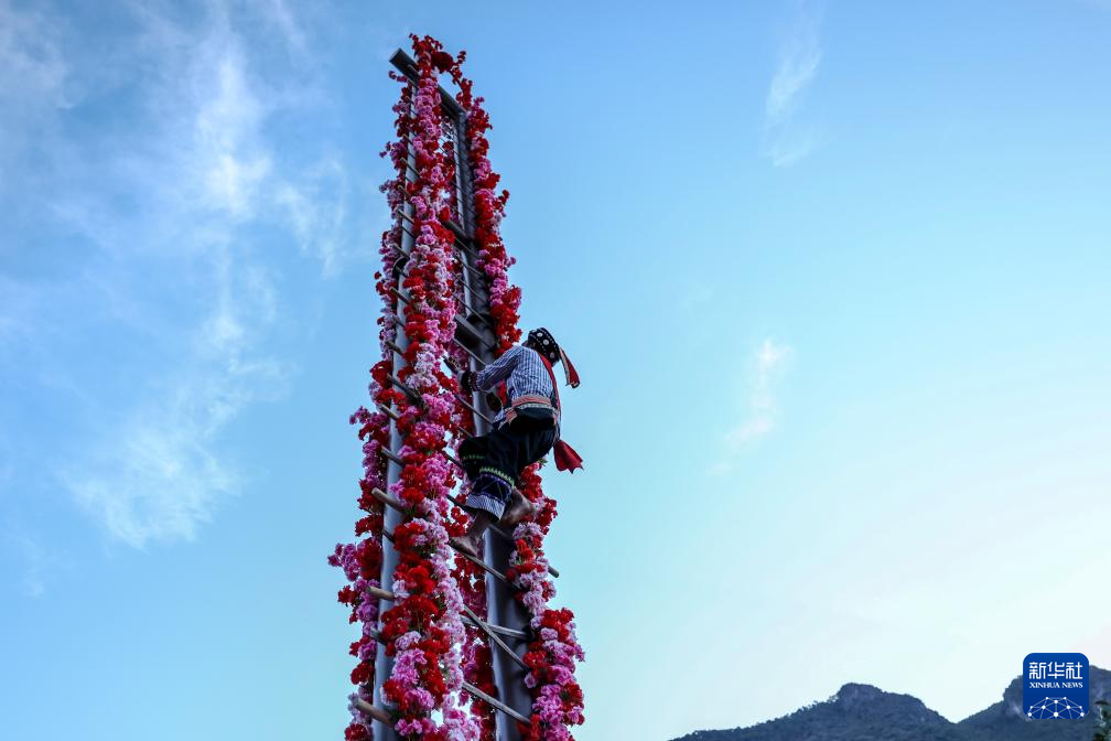 12月20日,一名傈僳族“勇士”在阔时文化节开幕现场表演“上刀杆”。