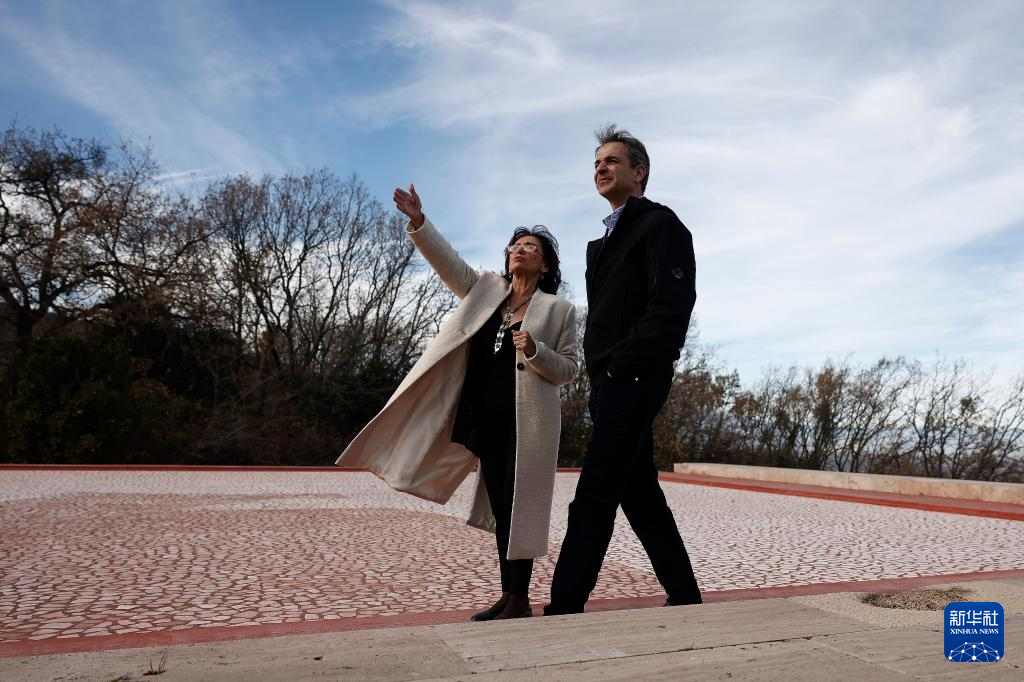 1月5日,希腊总理米佐塔基斯(右)参观位于希腊北部的古马其顿王国宫殿遗址。