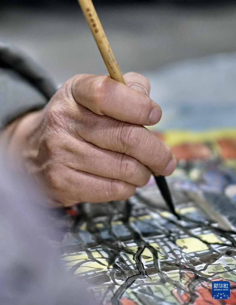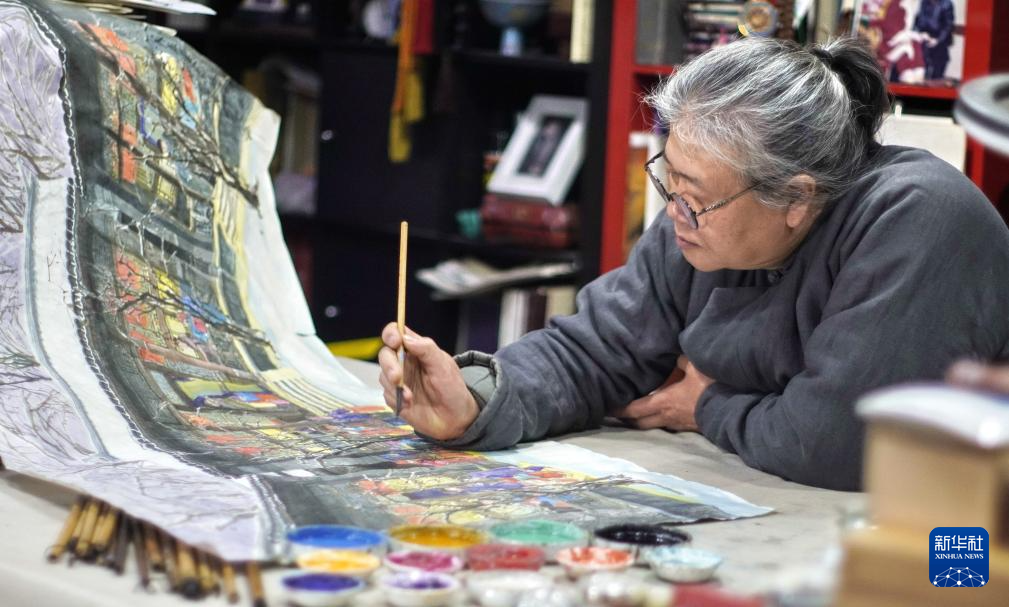 杨信在用传统绘画颜料进行创作(1月4日摄)。