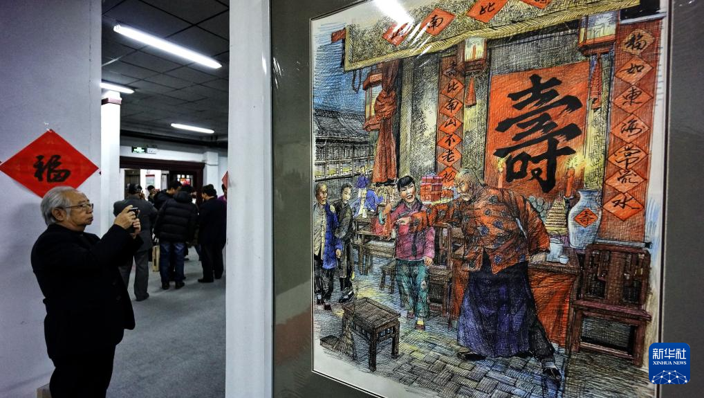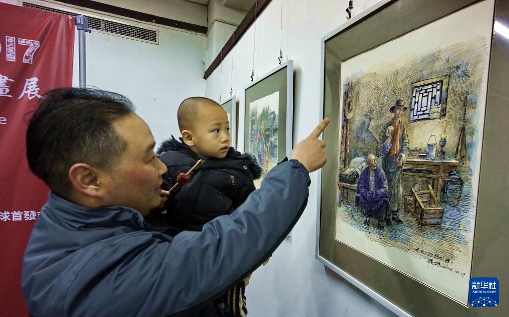 市民观看展出的杨信根据老舍先生的文学作品手绘的“老北京”风情画(2017年1月20日摄)。