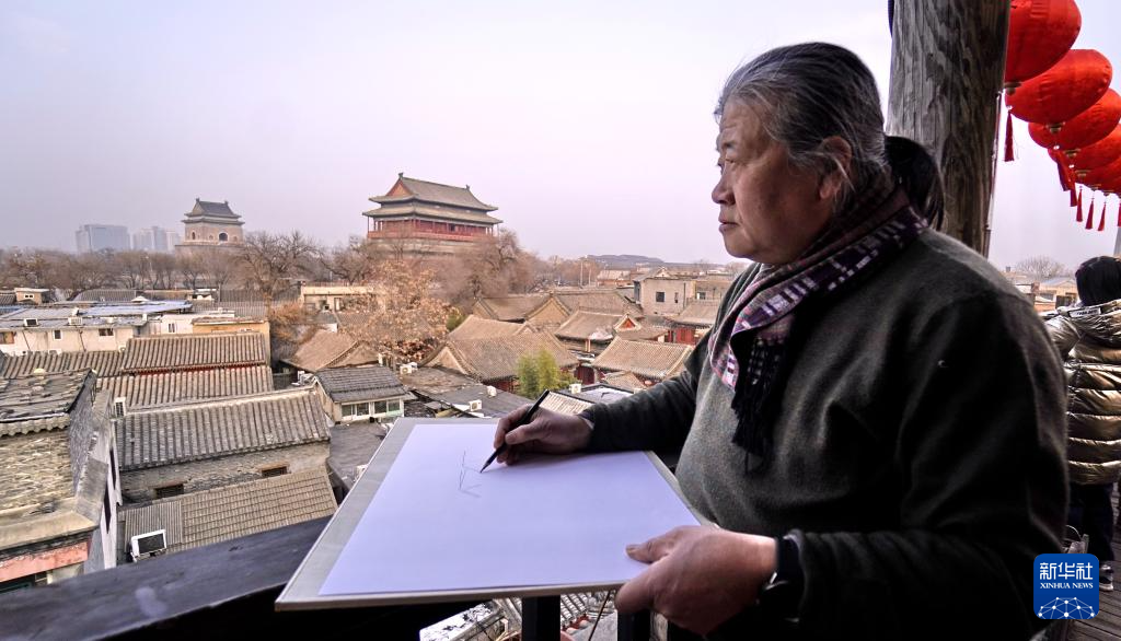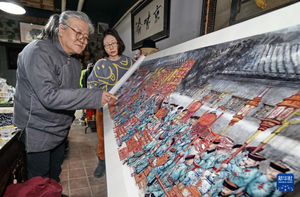 杨信(右)为来访的绘画爱好者介绍正在绘制的老北京风情作品(1月4日摄)。