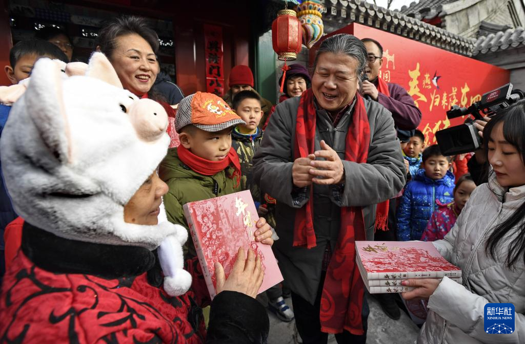 杨信给北京居民赠送他的手绘老北京民俗书籍《年味儿》(2019年2月3日摄)。