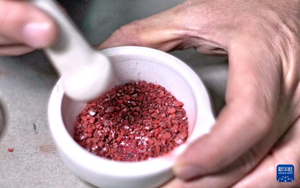 杨信捣制传统绘画颜料中的朱砂矿石(1月4日摄)。