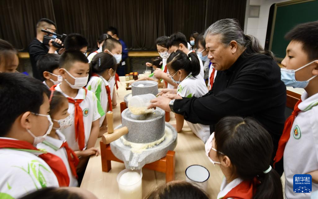 杨信在东城区东四九条小学为学生们讲述老北京生活故事(2021年5月31日摄)。