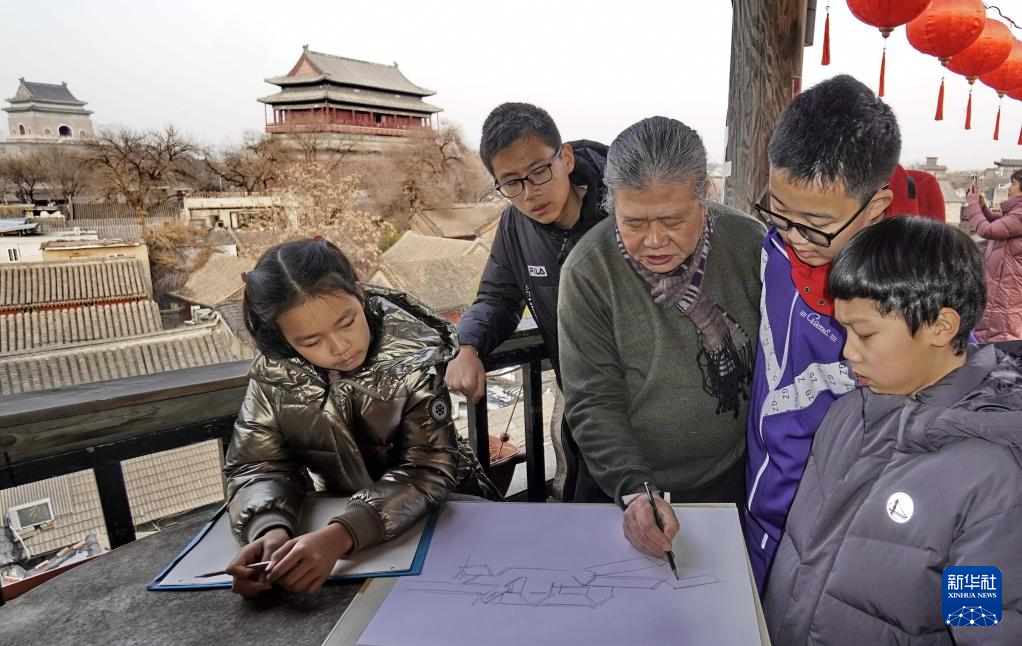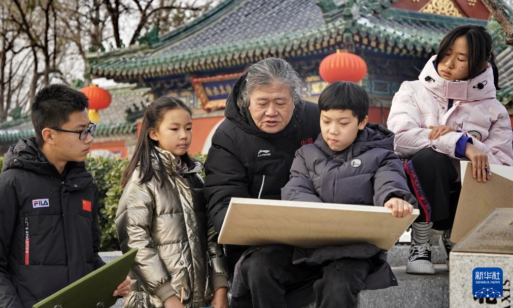 杨信(左三)在指导少年“京味绘画”爱好者们进行户外写生(2023年12月30日摄)。