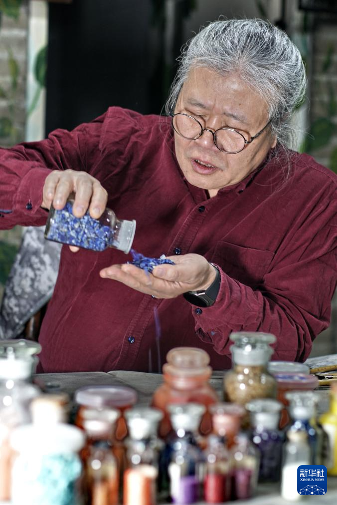 杨信用有色矿石磨制传统绘画颜料粉(1月4日摄)。