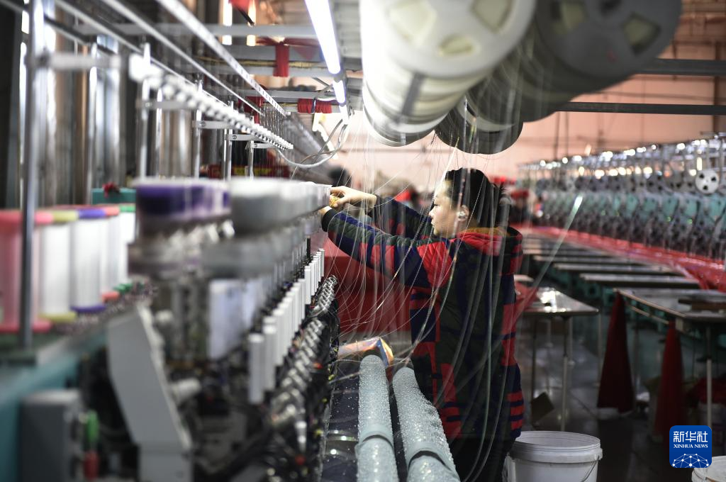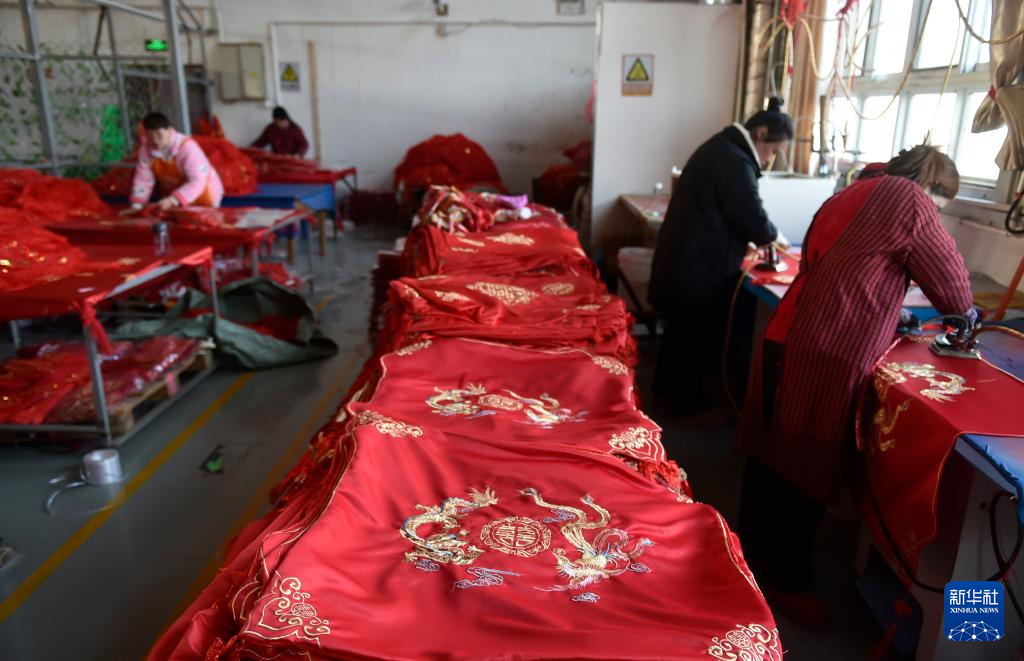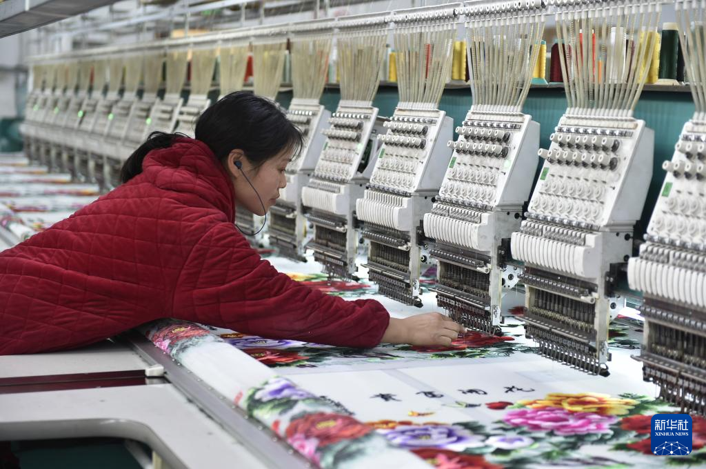 1月9日,汝州市汝绣产业园一家机绣企业的工人在生产车间内作业。