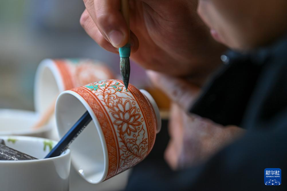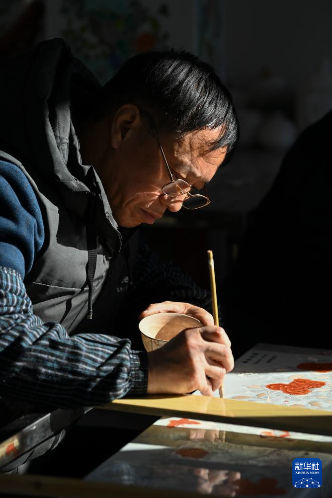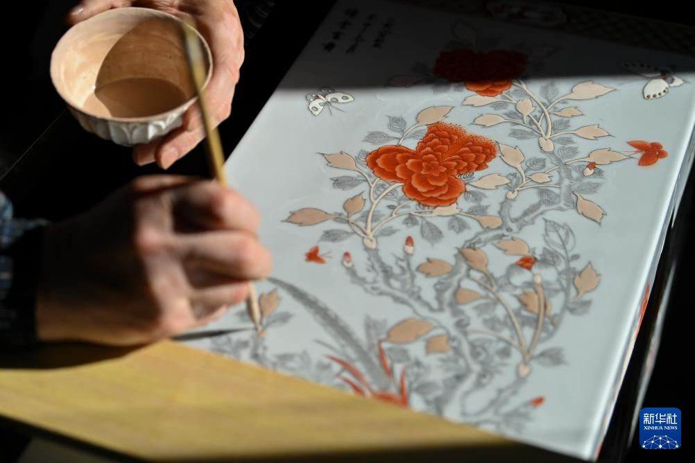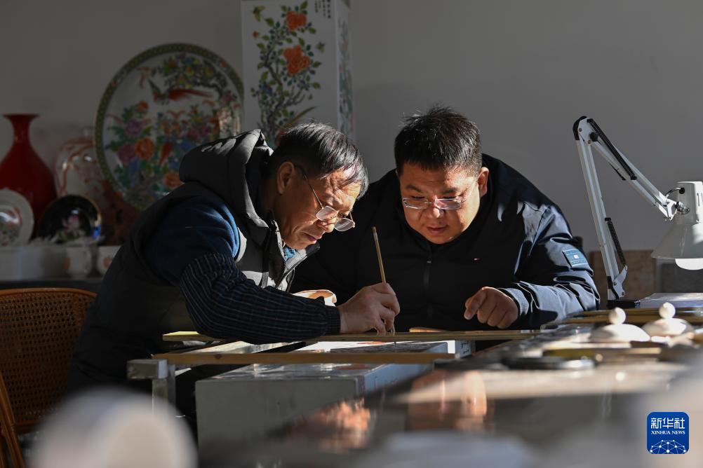 在位于山西省长治市上党区红绿彩村的生产基地内,工作人员在瓷器上进行彩绘创作(1月4日摄)。