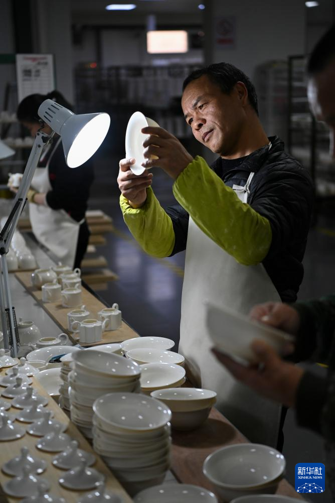 在位于山西省长治市上党区红绿彩村的生产基地内,工作人员在检查瓷器有无瑕疵(1月3日摄)。