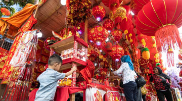 1月14日,在河南省开封市一年货批发市场,顾客在选购春节饰品。