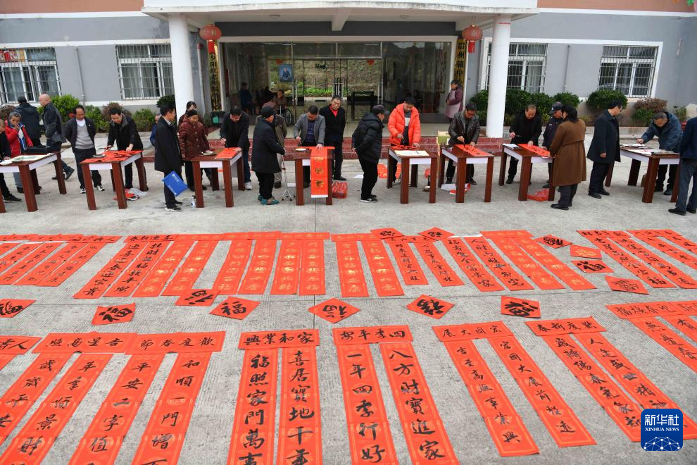 1月14日,书法爱好者在贵州省黔东南苗族侗族自治州黄平县旧州镇冷水河社区为群众书写春联。