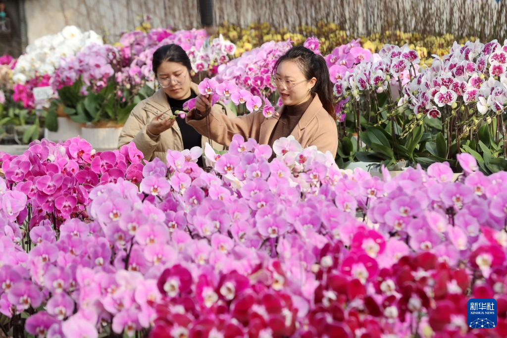 1月14日,在浙江省湖州市德清县莫干山镇高峰村花卉种植基地,市民选购蝴蝶兰。
