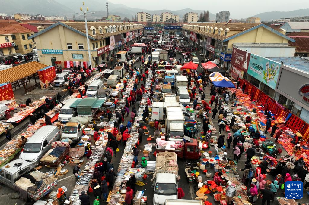 1月14日,在山东省青岛市崂山区王哥庄年货大集上,人们逛集市、置办年货(无人机照片)。