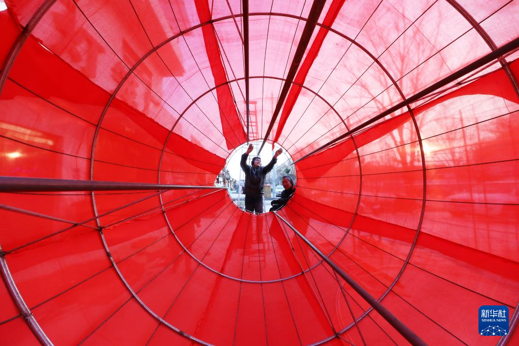 1月14日,在河南省焦作市温县北冷乡许北张村一家灯笼作坊,工人在赶制一个巨型红灯笼。