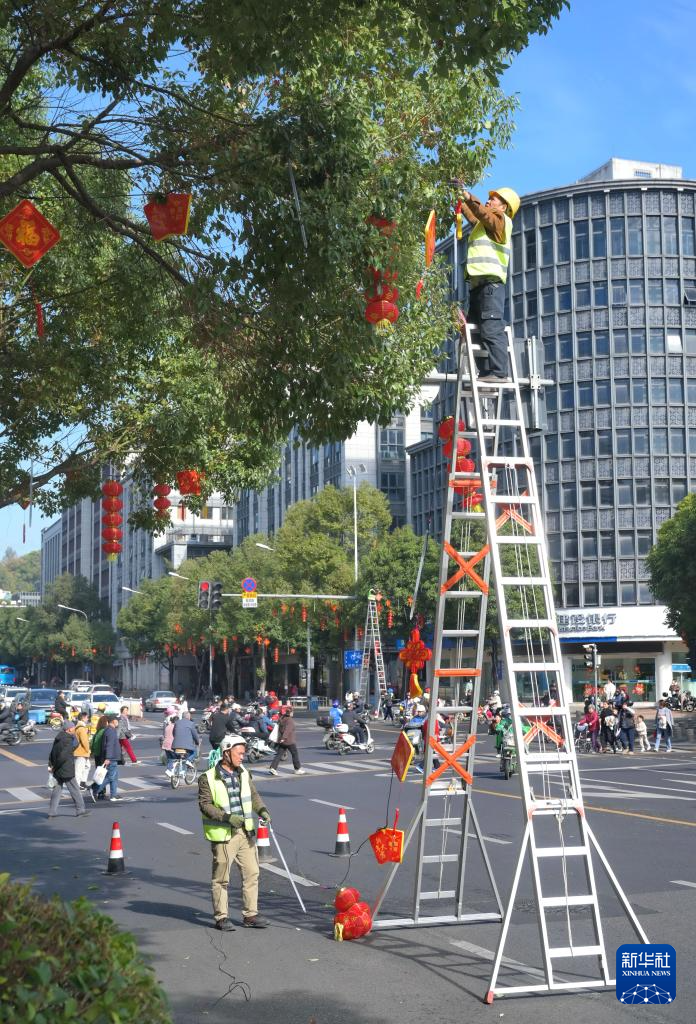 1月14日,工人在福建省福州市鼓屏路安装红灯笼。