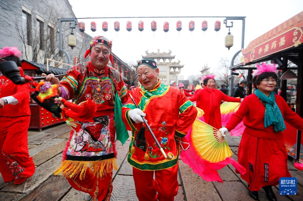 1月18日,民间艺人在山东省青岛市即墨古城进行秧歌表演。