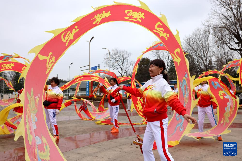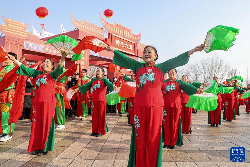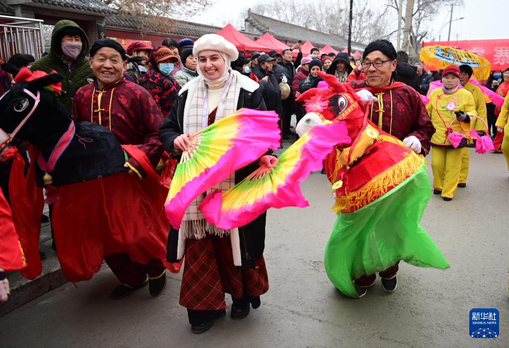 1月18日,在山东省聊城市东昌府区堂邑镇“浓情腊八”乡村民俗文化展演活动现场,在聊城大学留学的留学生张娜(中)与当地群众一起扭秧歌,体验中国民俗文化。